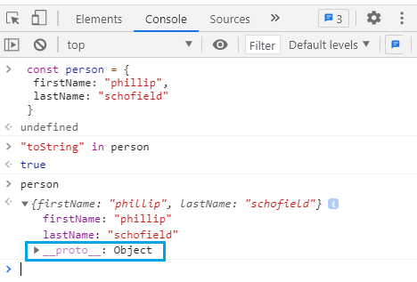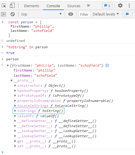JavaScript does not find the toString property defined inside the person object. Therefore it moves up the prototype chain looking for the property and finds it defined inside the person object’s prototype, which in our case is Object.prototype - an object that sits at the top of the prototype chain (that is its prototype is null) and comes standard with JavaScript. This is the reason why the console logs in true as the output.
