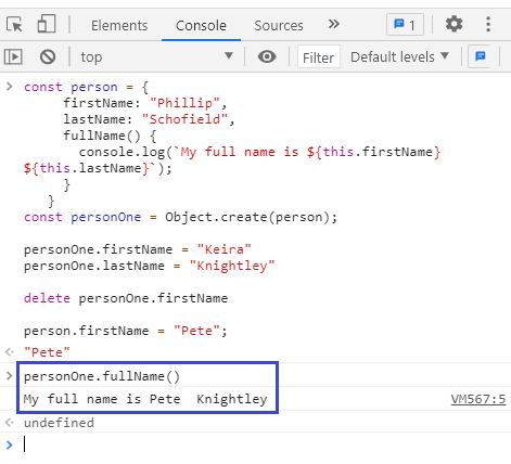 Now if we log personOne.fullName() to the console, we get My full name is Pete Knightley.