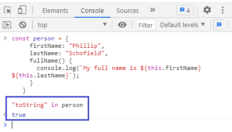 At first glance, you might say that the output will be false because the person object does not have a toString property. But lo and behold, we get true as our output.