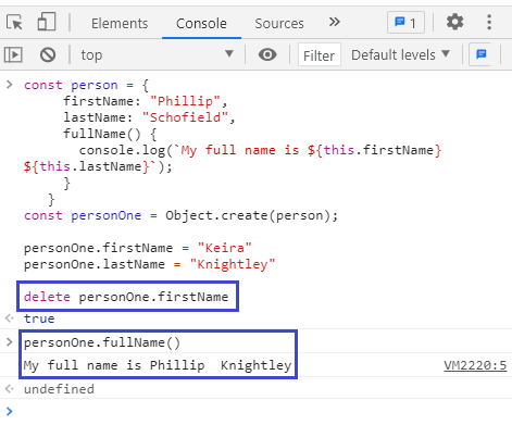 We get My full name is Phillip Knightley. Because, even though we had deleted the firstName property, personOne object inherited the firstName property from its prototype (the person object).