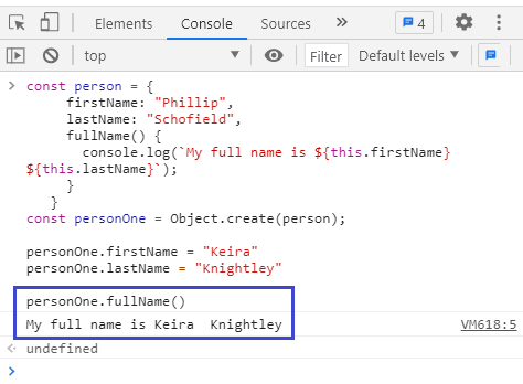 Now personOne is no longer an empty object. It has its own firstName & lastName properties. If we log personOne.fullName() to the console, we get My full name is Keira Knightey.