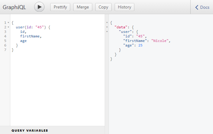 Make sure both the servers are running. Then go to GraphiQL and make a query for the user with an id of 45. And we get the response from the JSON server. Perfect.