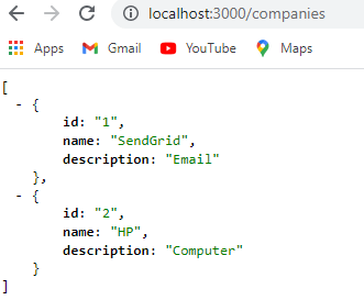 Now if we visit the JSON server at http://localhost:3000/companies, we get the list of companies that we have defined inside the db.json file.