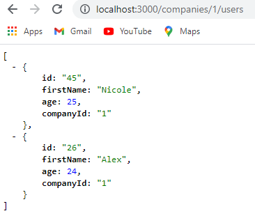Because we have added the companyId property on each user, JSON server has behind the scenes mapped the relationship between the users and companies. So, if we visit http://localhost:3000/companies/1/users, we will get the list of users working at the company with an id of 1.