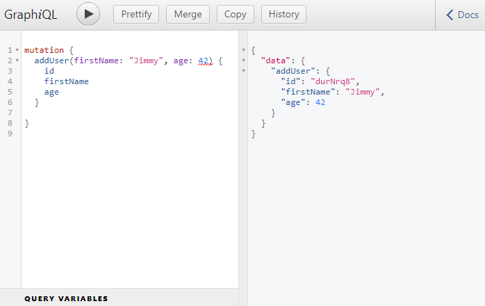And if you click on mutation, you should see the addUser() mutation. The exclamation marks after the String denote that the property is required.
