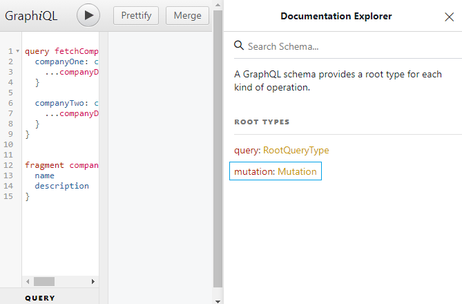 Now, if you open up the Documentation Explorer panel in the GraphQL IDE, you should see the mutation type.