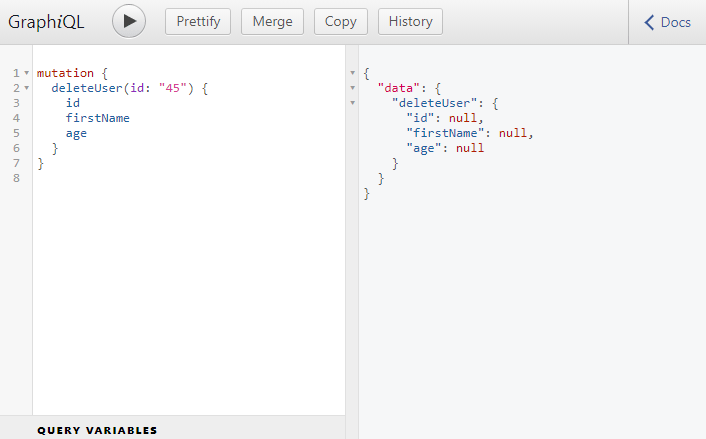 Let's try to delete a user from the GraphiQL IDE using the deleteUser() mutation.