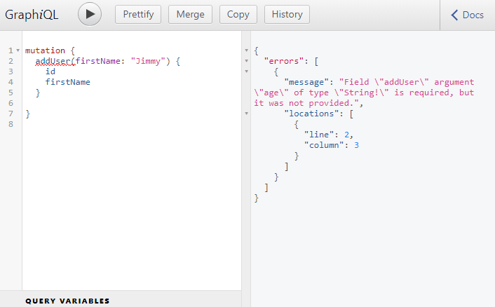 If we try to add a user without the age property, we will get an error, because, we have defined the age property to be required in the addUser() mutation by using the GraphQLNonNull helper.