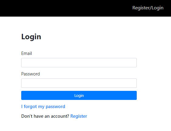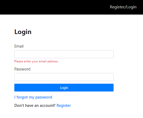 A first time user must register first using the Register link at the bottom of the login form. When the user fills in the registration form and clicks on the Register button, we direct them to the login form.