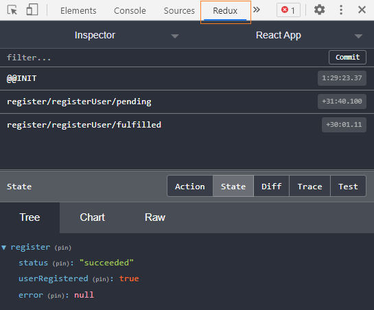 I have installed Redux DevTools as a browser extension in Chrome. Open Chrome DevTools and click on the Redux tab. Then click on the State tab. You will see the global Redux store. As you can see, the user registration is successful.