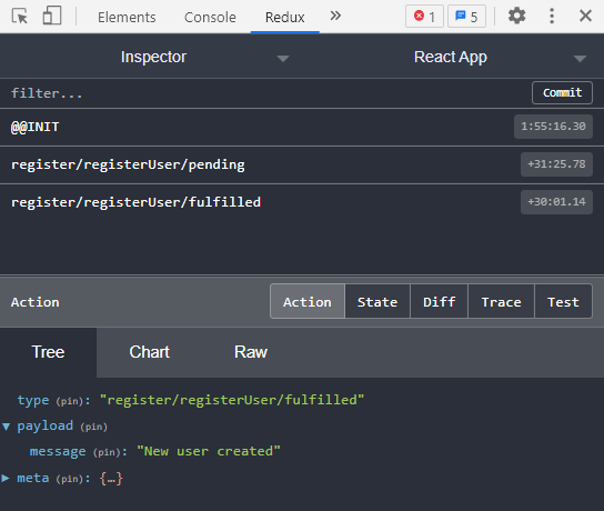 If you click on the Action tab, you will see the actions types generated by the userRegister thunk.