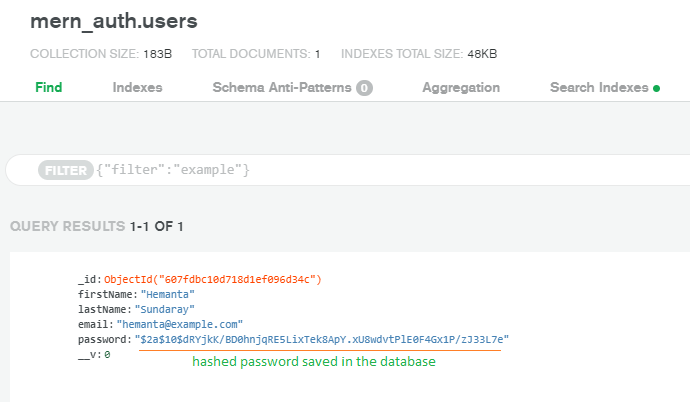 Login to your MongoDB Atlas account. If you check the database, you should see a new document inside the users collection. You would also notice that the password saved in the database is hashed.
