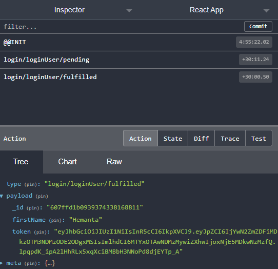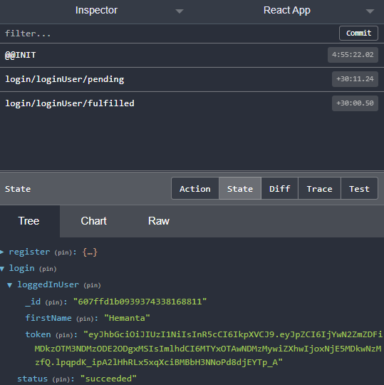 Also, if you check Redux DevTools, you can see the state and the action types generated by the loginUser thunk.