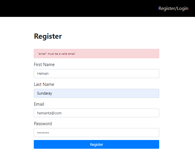 This means that we will not get any validation error messages even if we try to register using an invalid email address. However, we are checking for the validity of the email address server-side in the validate.js file. So, if I register using an invalid email address (hemanta@com for example) registrationValidation(req.body) will produce an error and the error message should be displayed on top of the form.