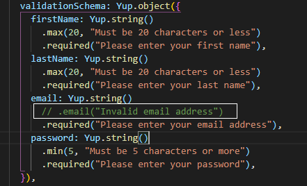 In addition to client-side validation, we are also doing server-side validation. In order to make sure that server-side validation is working as expected, we will temporarily comment out the highlighted code line as shown below in the RegisterForm.js file.