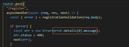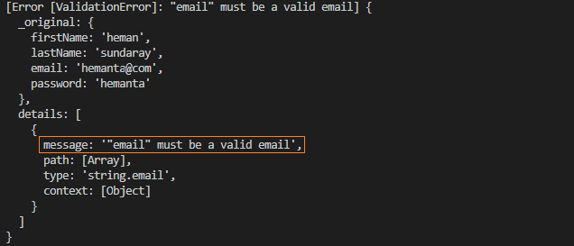 You will understand the above line of code when you console log the error object as shown below. The error message is available as the value of the message key. And the object the message key is part of is the first element of the details key, which is an array.