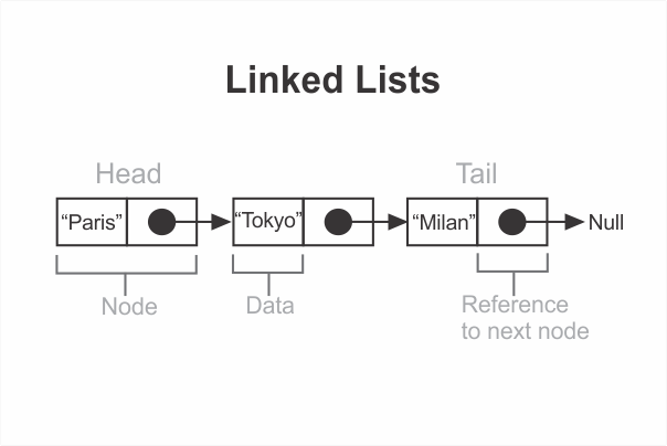 A linked list’s first node can be referred to as its head and the final node as its tail. A tail node doesn’t have reference to any other node.