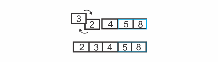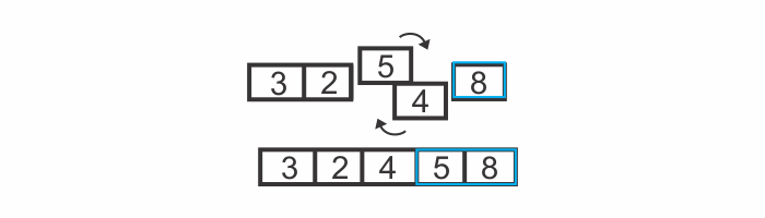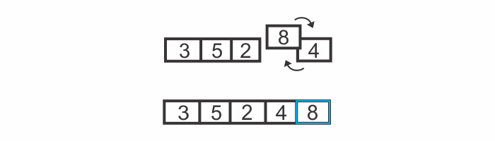 We now know for a fact that the 8 is in its correct position within the array, because we kept moving it along to the right until it reached its proper place. The diagram above has blue border lines surrounding the 8 to indicate that the 8 is officially in its correct position.