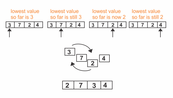 Once we’ve determined which index contains the lowest value, we swap its value with the value we began the pass-through with. This would be index 0 in the first pass-through, index 1 in the second pass-through, and so on. The diagram above illustrates making the swap of the first pass-through.