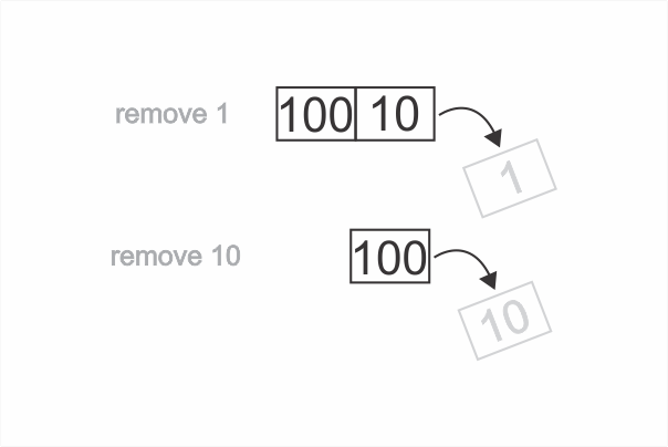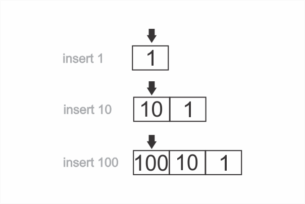 First we insert 1, then we insert 10, then we insert 100: