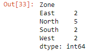 We have four unique values: East, West, North, South. Next, we will create our zone segments using the groupby method.