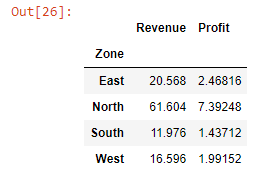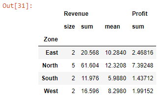 zones.agg({"Revenue" : ["size", "sum", "mean"], "Profit" :"sum"})