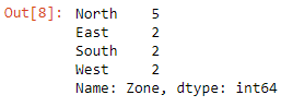 We can check the unique values and their counts in the Zone column using the value_counts() method.