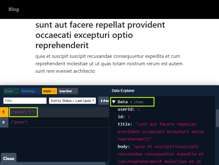 We can see that the post is cached under the query key ["posts", 1]. (We clicked on the first post, so the postId is 1.)