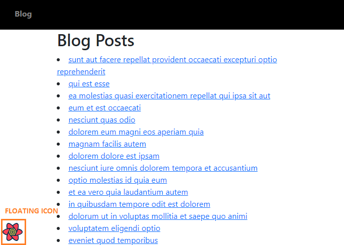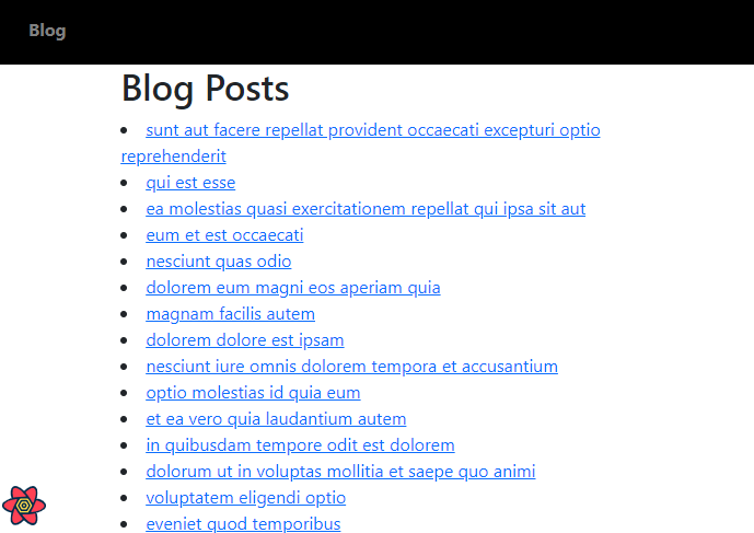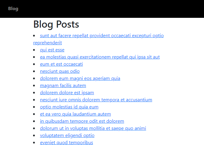 Our application will have a navigation bar with a Blog link. When we click on this link, we go to the /posts route, where we render the Posts page, which displays a list of blog posts fetched from JSONPlaceholder, a fake REST API.