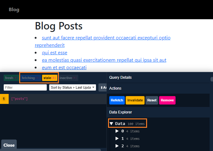 Now, click on the icon and open the dev tools. When we click on the posts query key, we will see one more panel open in the right, where we will see the list of blog posts that we fetched from the /posts API endpoint. We can say that the posts list is cached under the posts query key. Now, refresh the page. You will notice that the state of the query changes from fetching to stale.