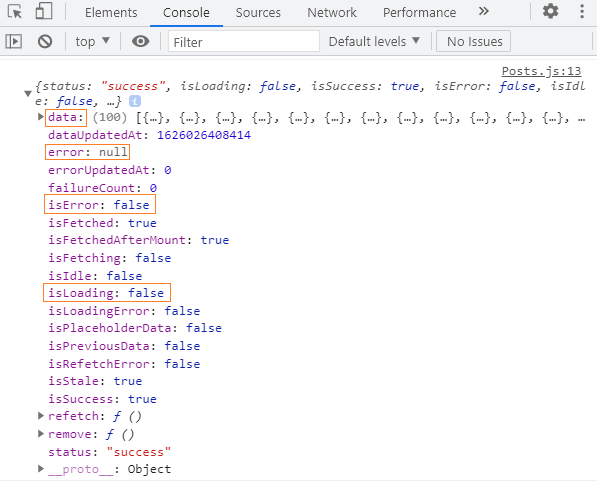 The query result returned by useQuery contains all the information about the query. On line 13, we have logged the queryResult variable to the console, but we can't see anything on the console because we have not yet rendered the Posts component.