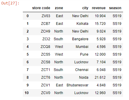 First, we selected the store code & revenue columns for all rows and then we pulled out rows with indices 0, 1, 2, 3 & 4.