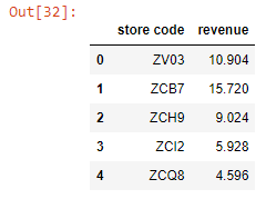 data[['store code', 'revenue']][:5]
