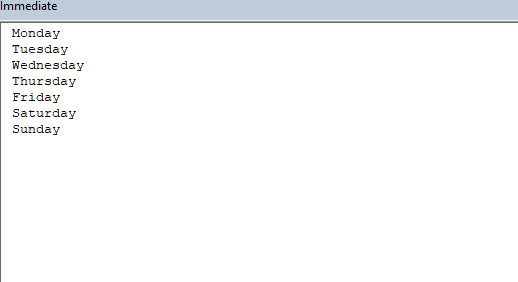 After executing the procedure above, the daysofweek array gets populated with the values present in the range A1:A7. Let's prove this by printing the array elements to the immediate window: